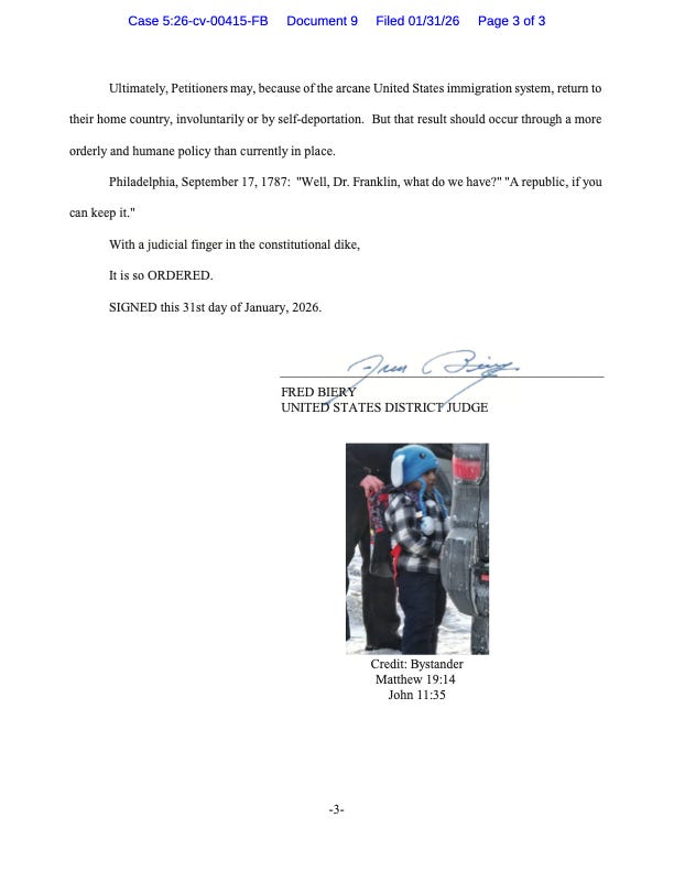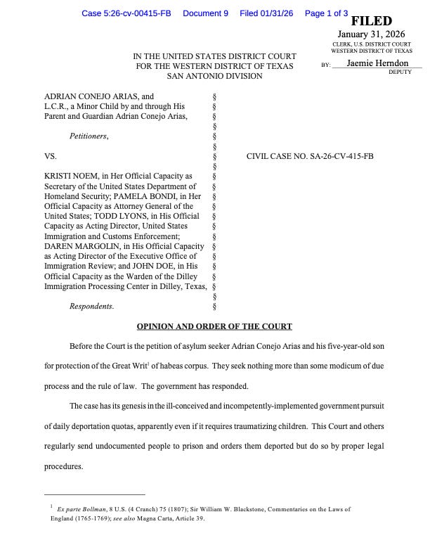 I’ll let that sit. Lastly, I’ll conclude today with another federal court order, this time involving a father and a five-year old detained by ICE in Minnesota and quickly transported to Texas. Judge Fred Biery of the U.S. District Court for the Western District of Texas ordered their release. But in doing so, Judge Biery issued a pithy, three-page opinion that, honestly, deserves a read by everyone. It draws on the genesis of this nation and the animating concerns of the Declaration of Independence. At bottom, it pulls on the morality of each and every one of us.